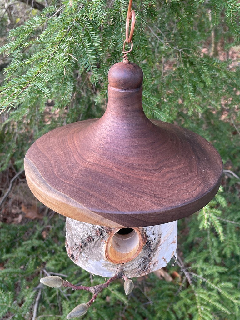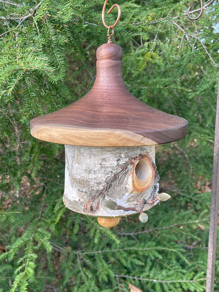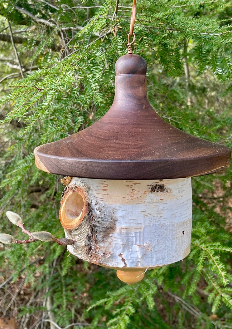 This is an exceptionally handsome Black Walnut and White Birch bark usable birdhouse with a knot opening. It has a lovely roof and a distinctive finial on the bottom. It comes with a solid swirly hand made copper hook for hanging. Whether you hang this outside or enjoy it somewhere in your home, it is sure to please. This is sized for Wrens, Chickadees, Titmice and Nuthatches. It opens easily for cleaning & is finished with pure Tung oil. It's the perfect gift for a nature lover!