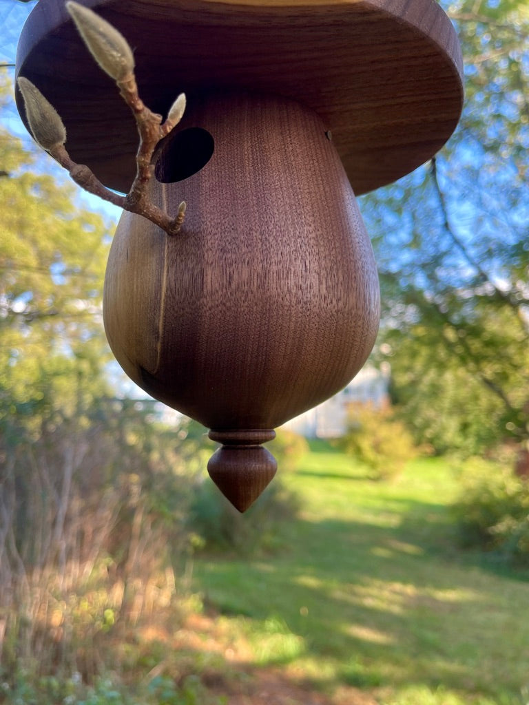 This is just a beautiful usable Black Walnut turned birdhouse. This Wood is gorgeously highly figured both on the roof and body. 1 1/8" opening accommodates wrens, chickadees and titmice.